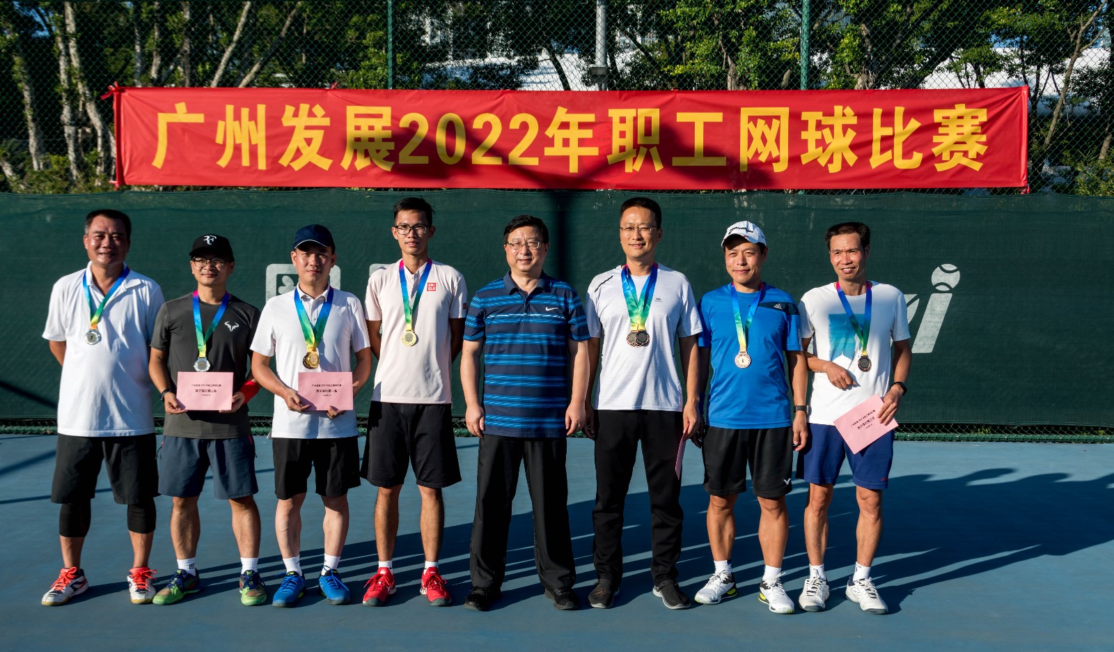 2022年10月22日,伟德国际1946工会在二沙岛宏城网球场举办了2022年职工网球比赛。比赛设男子单打、男子双打、混合双打三项,共40名职工参赛,罗志刚主席全程参与活动并为获奖职工颁奖。比赛紧张激烈,参赛职工欢聚一堂、激烈角逐,比技术、拼体力、比韧劲、讲配合,奉献了一场场精彩的比赛。